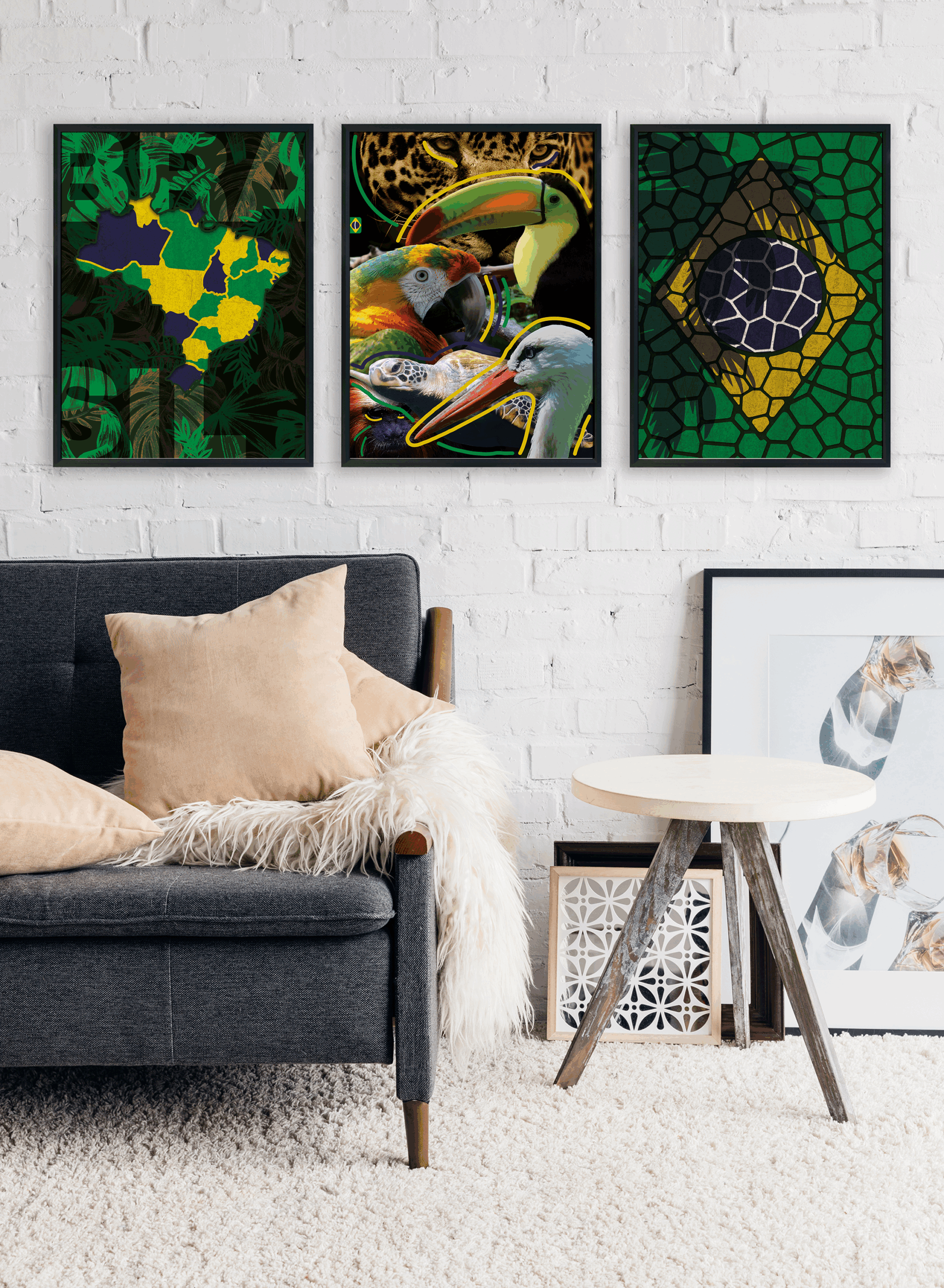 O objetivo era transmitir a beleza do país em cores, texturas, animais, utilizando as cores da bandeira e da natureza tropical do Brasil. O kit de pôsteres Brasil tropical tem três imagens bem coloridas, que ficam lindas e alegram qualquer ambiente.